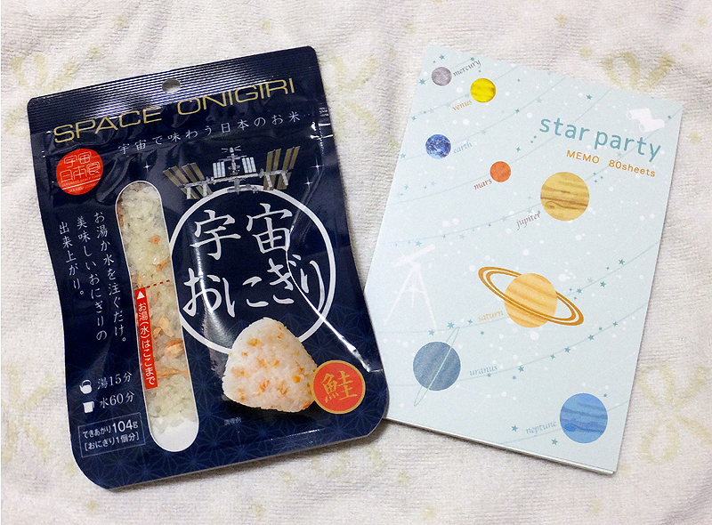 惑星がちりばめられたメモ帳と、何と!本物の宇宙食のその名も「宇宙おにぎり」!