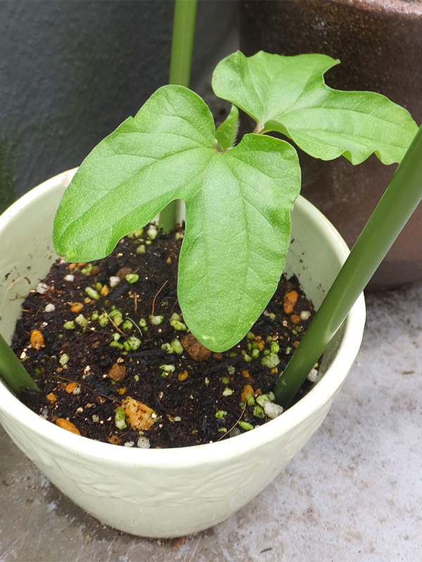 でもってもう一つ、かつて朝顔が植わっていた鉢も芽が出まして…。