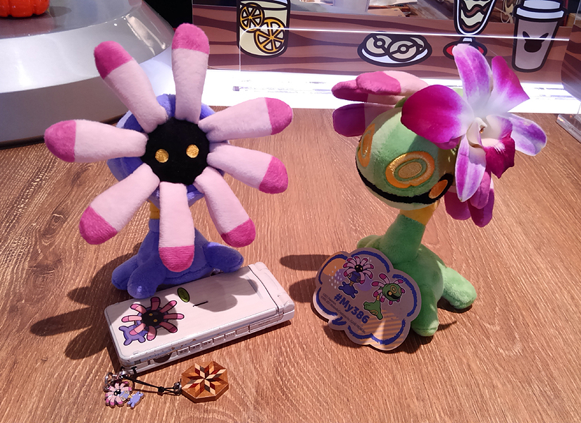 店内のデカいピカチュウカップルとパチリ。自作デンヂムシ君は