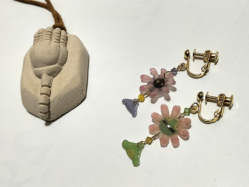 かなめいしはイヤリング、ねっこのかせきはペンダントトップに加工。