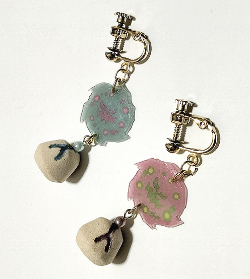 イヤリングはプラバンのみで制作。焼き縮めた後、ピンバイスで穴を開けました。
