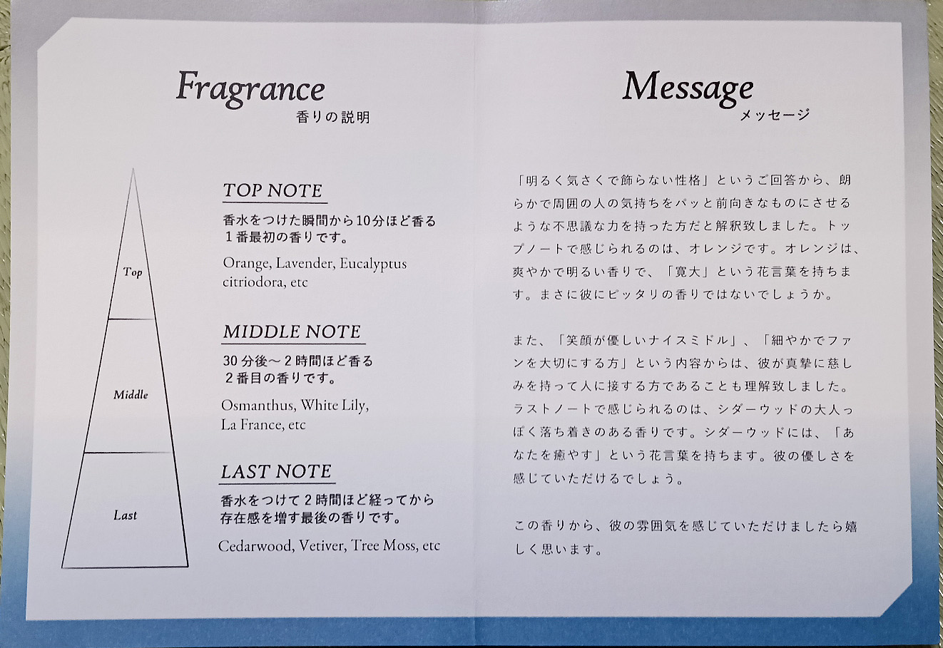 全て香りに込めてくれた。そんな素晴らしい香水が出来上がりました。